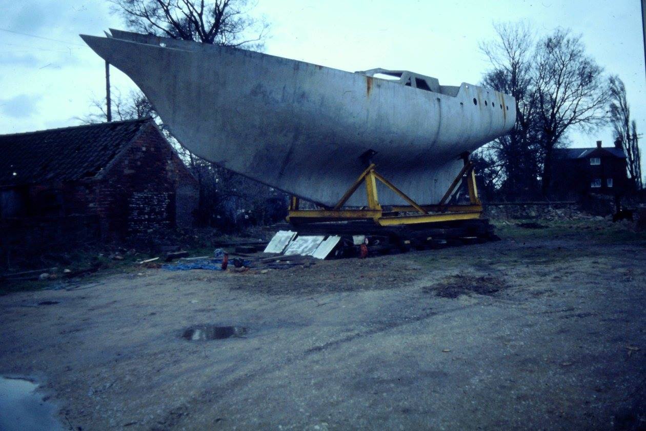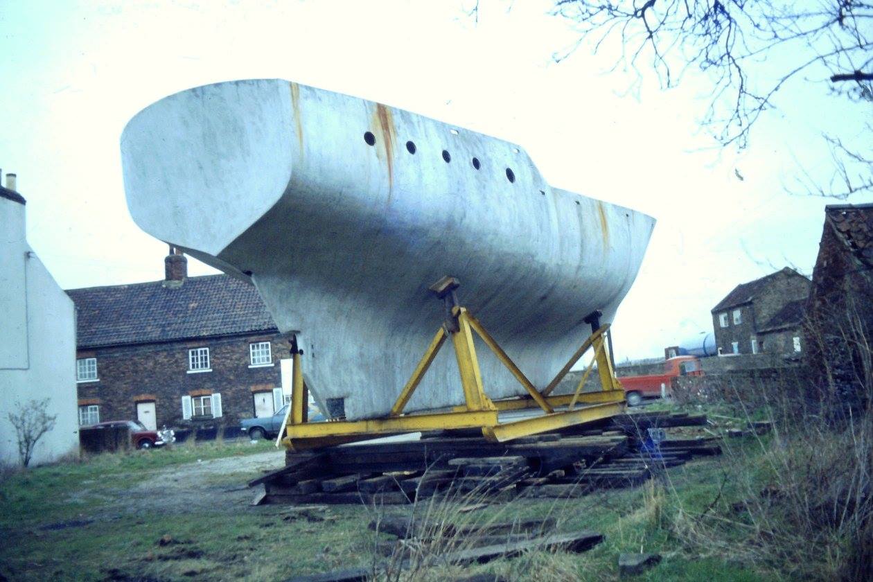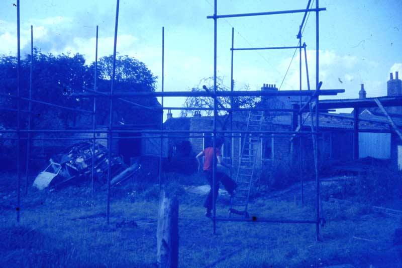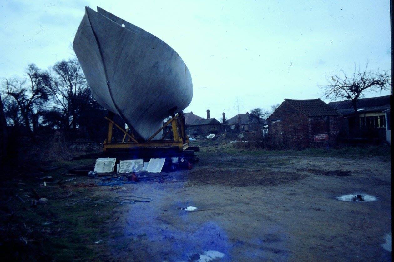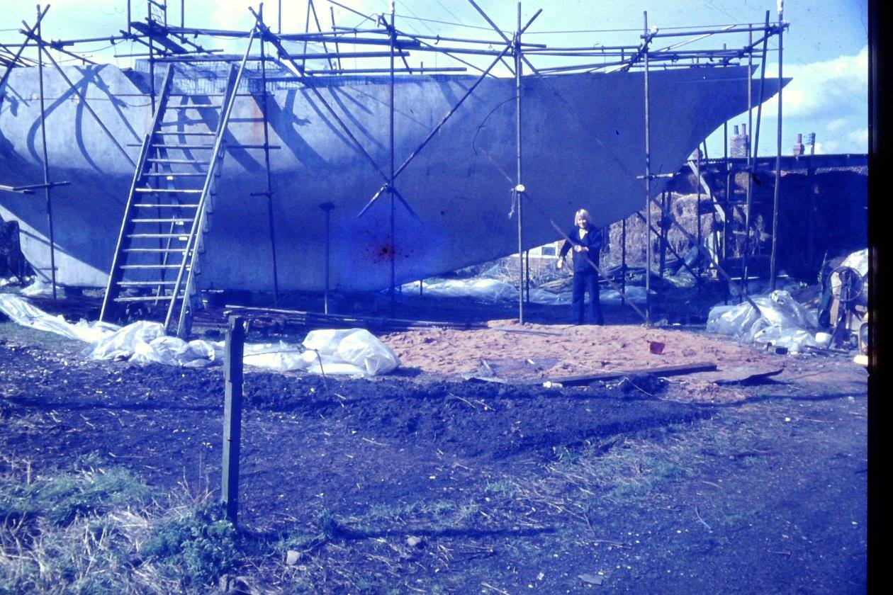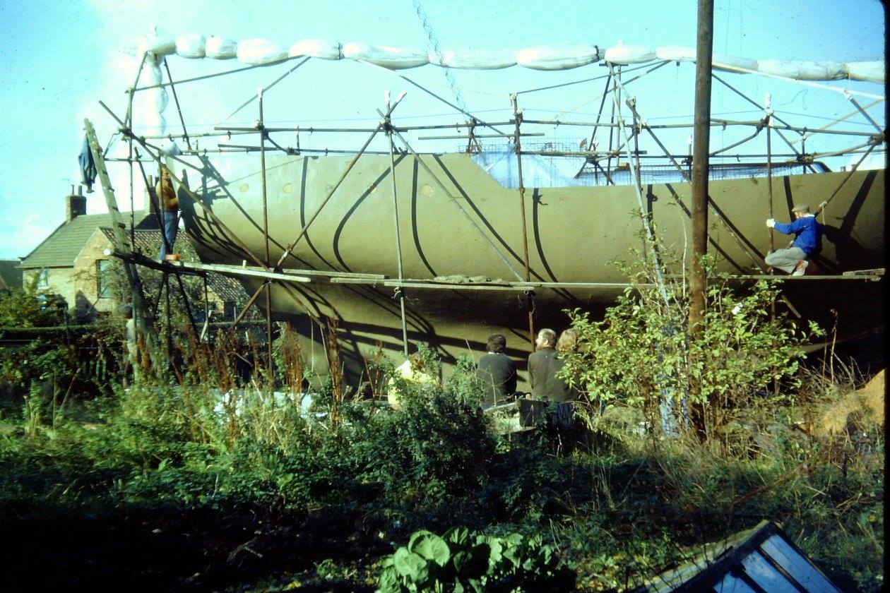The images below show the starting of the project in Hensall close to Snaith and eggborough at the back of the old garage. Click here for the location, which now has a house on it. Shortly after Bob and I got the frames made on lofted in the scaffolding, a sever storm hit the boats and my boat fell on top of Bob’s. Bob gave up and I continued. The girl in the images is Sue Wheeldon, my girlfriend at the time.