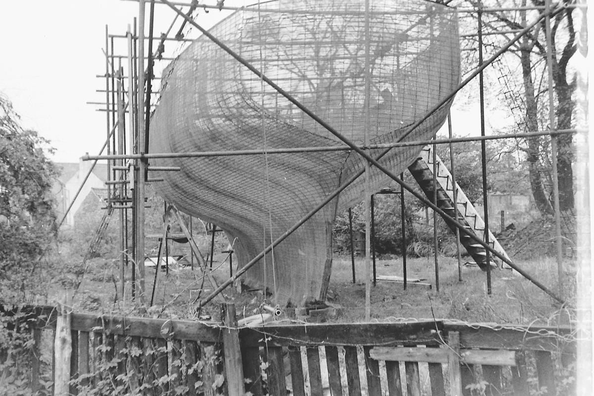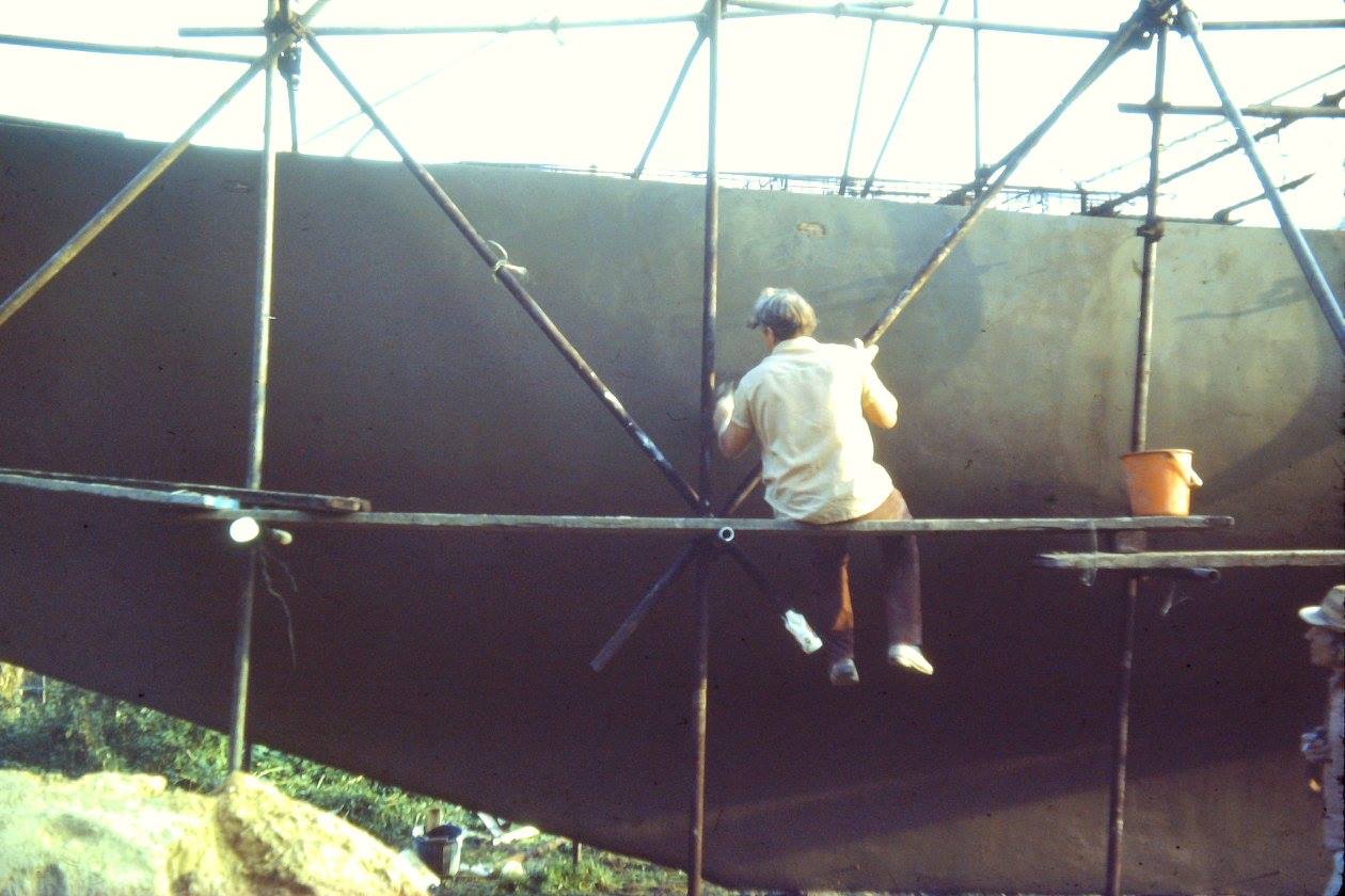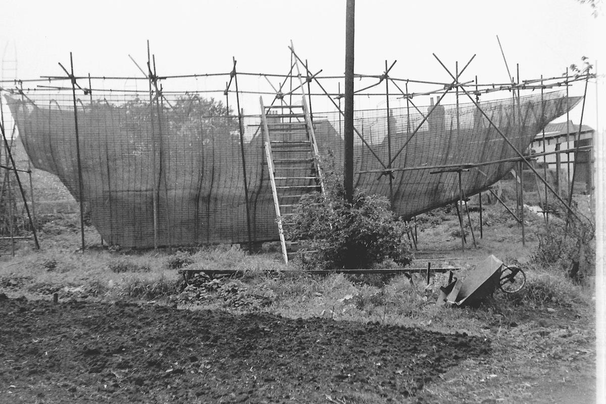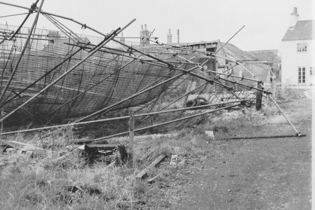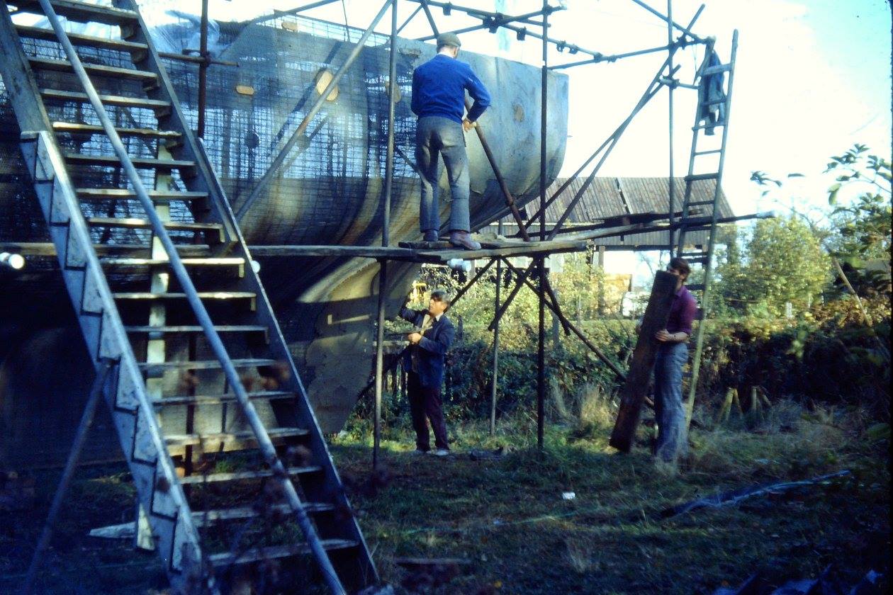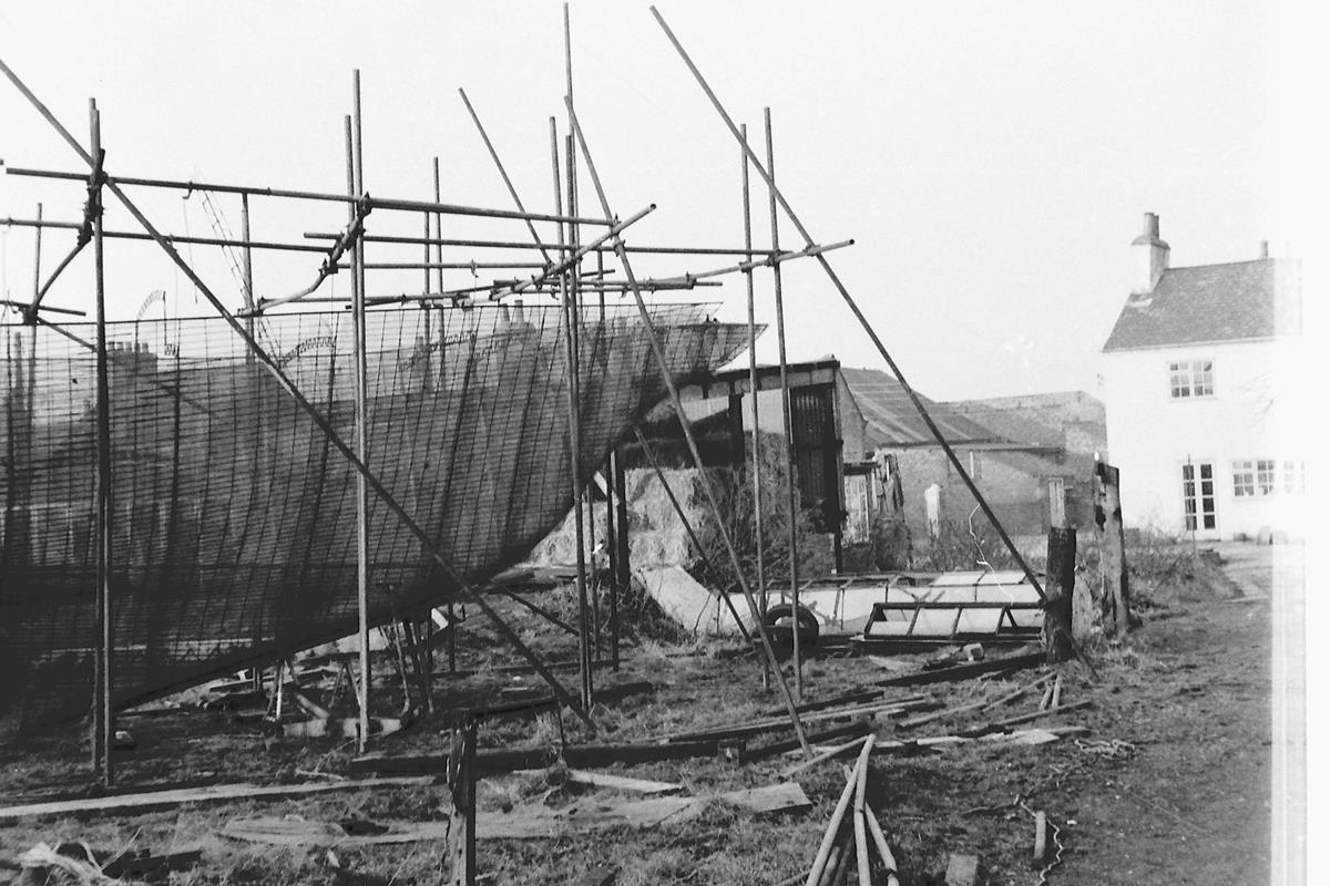 The images below show the starting of the project in Hensall close to Snaith and eggborough at the back of the old garage. Click here for the location, which now has a house on it. Shortly after Bob and I got the frames made on lofted in the scaffolding, a sever storm hit the boats and my boat fell on top of Bob’s. Bob gave up and I continued. The girl in the images is Sue Wheeldon, my girlfriend at the time.