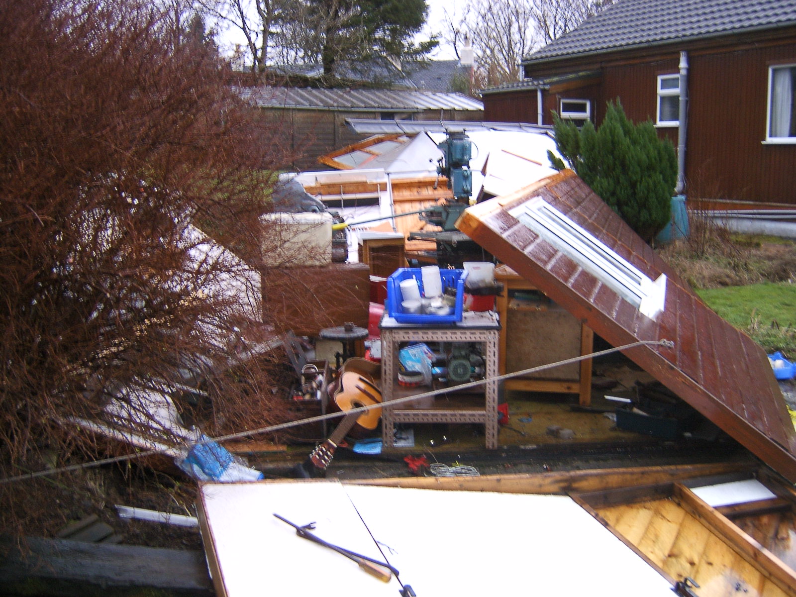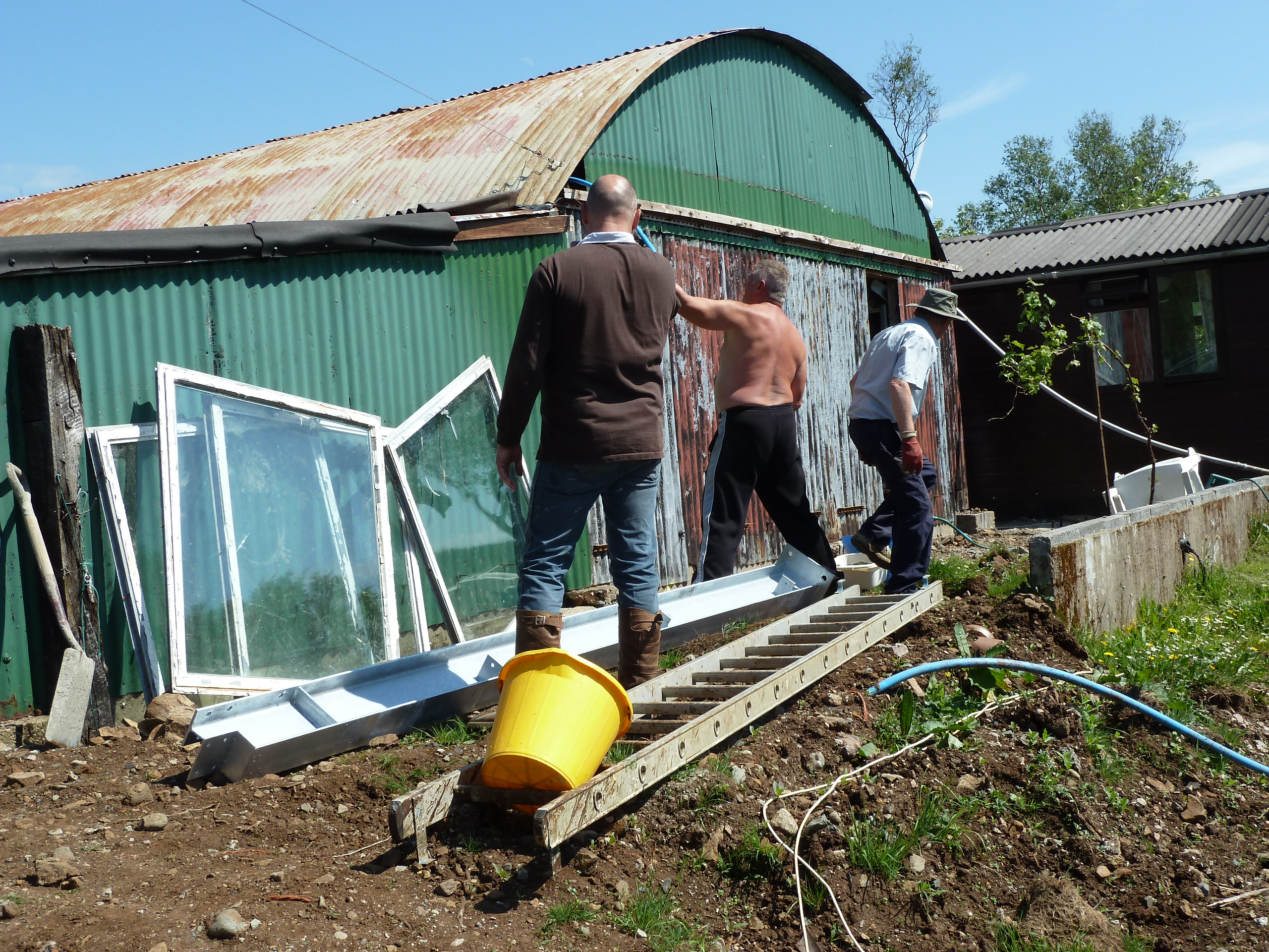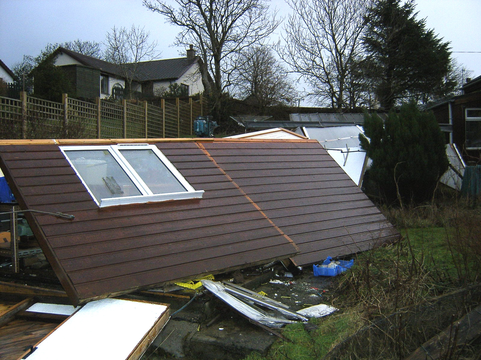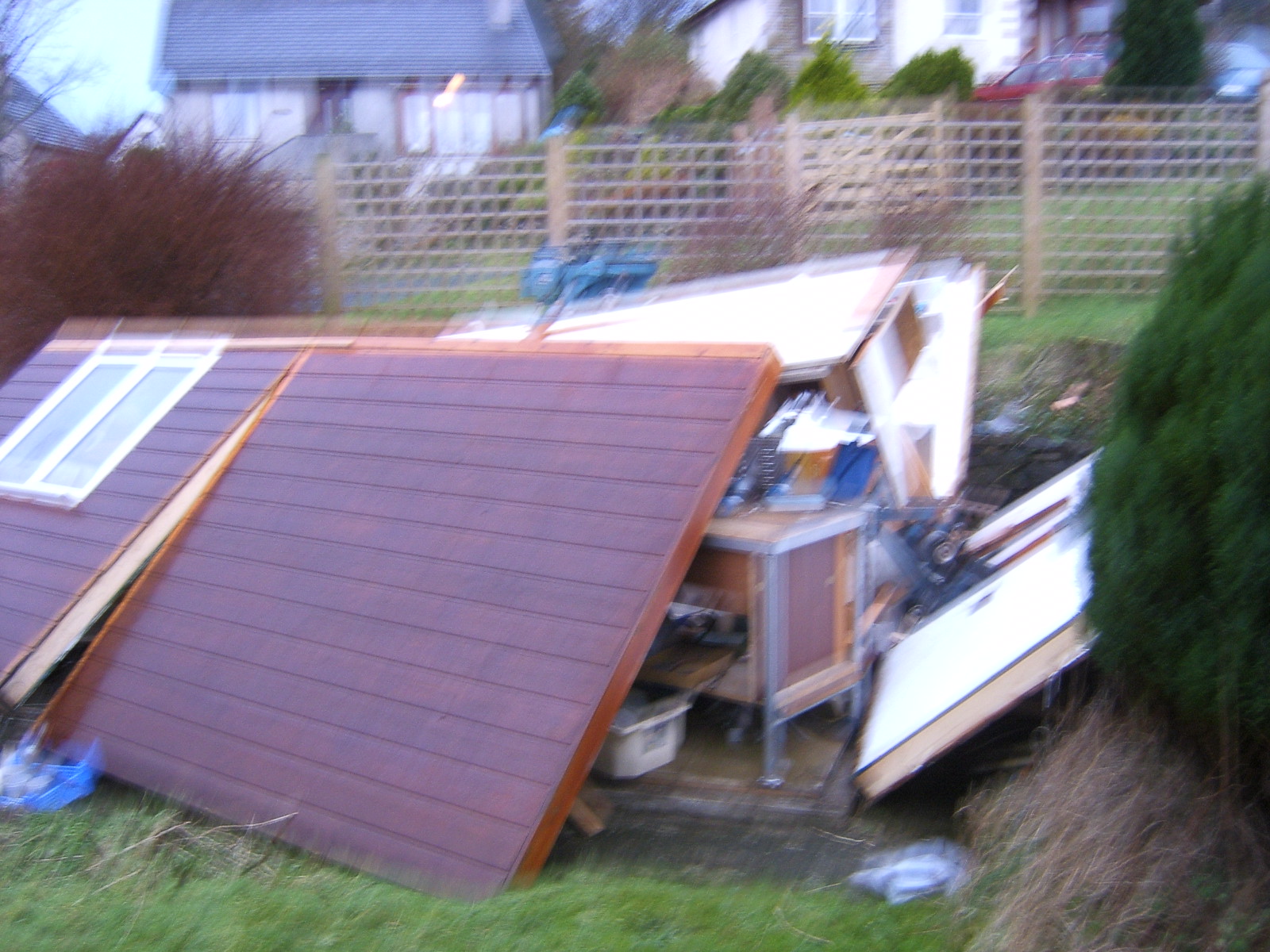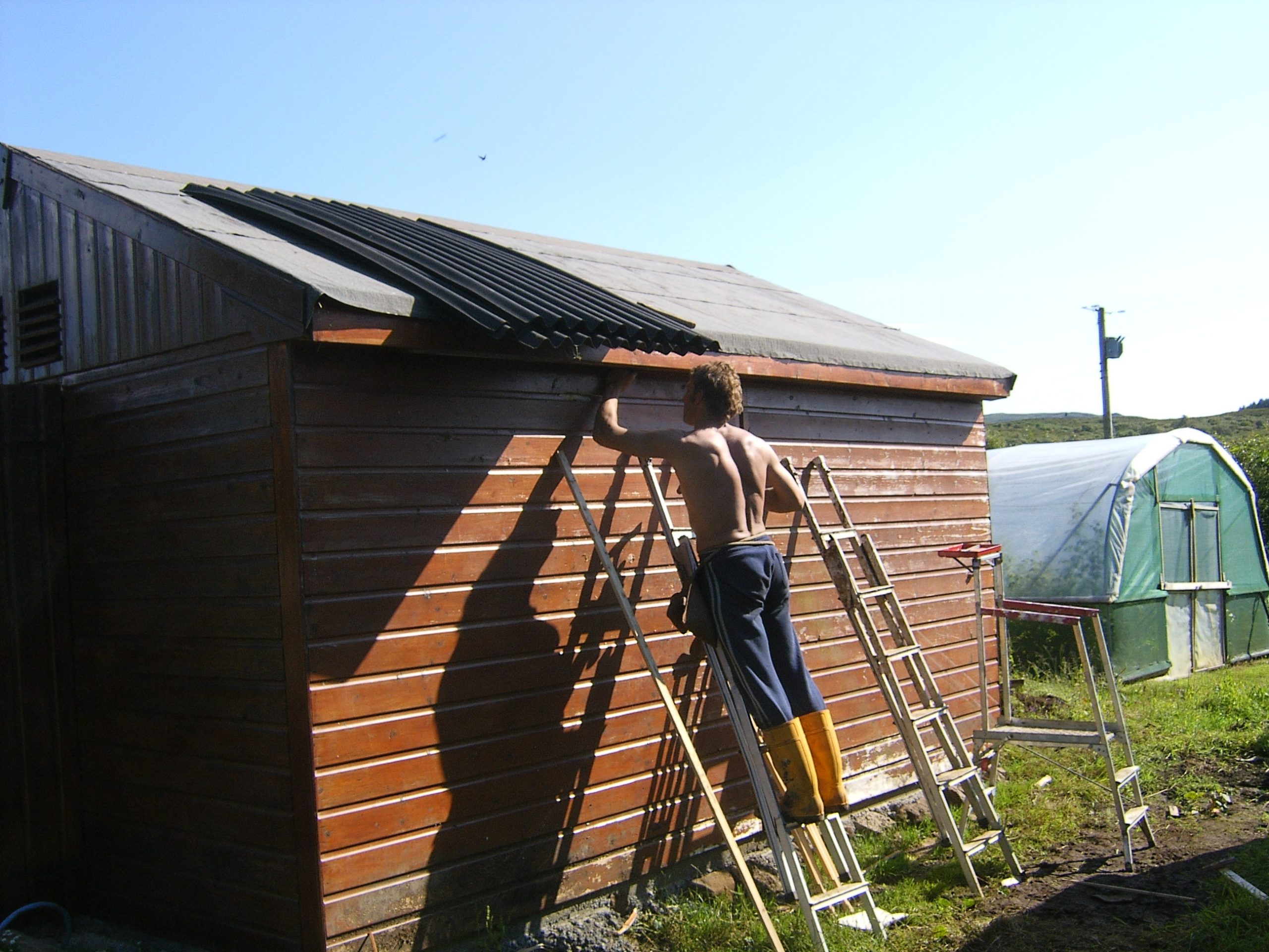 The shed below was at Tigh Fiare and got blown down in winter gales, Jan 2004. It had all of our tools in it, so its repplacement was a priority.